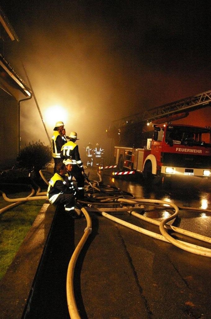 Dauer: 4 Std Einsatzdokumentation: Durch Sirene und Funkwecker wurde die FF Heiligenstadt alarmiert. In Störnhof (Gemeinde Wiesenttal, Lkr. Forchheim) brennt eine Scheune. Schon bei der Anfahrt war der Feuerschein weit sichtbar - das bzw. die Gebäude befanden sich bereits im Vollbrand. Die Löschwasserversorgung war bereits aufgebaut und verschiedene Wehren im Einsatz. Wasser wurde aus dem Löschwasserbehälter in Störnhof und über eine 1,2 km lange Schlauchleitung aus dem Behälter in Oberfellendorf bezogen. Mit den Tanklöschfahrzeugen wurde ein Pendelverkehr zur Wiederbefüllen der Behälter durchgeführt. Zusätzlich beteiligten sich einige Bauern mit ihren Güllefässern am Wassertransport. Bei dem schweren Gewitter schlug ein Blitz kurz nach 1 Uhr in eine 250 m² große Maschinenhalle ein und setzte sie in Brand. Beim Eintreffen der ersten Feuerwehren hatte das Feuer bereits auf die 150 m² große Stallung übergegriffen. Ca 30 Kühe und Kälber wurden aus dem brennenden Gebäude geholt. Durch Hitze und Feuer wurden zwei Wohngebäude ebenfalls in Mitleidenschaft gezogen. Vier Personen wurden verletzt (drei mit Rauchvergiftung und Schock, ein Helfer zog sich leichte Verletzungen bei Einfangen der Kühe zu) und vom Rettungsdienst ins Krankenhaus gebracht. Es entstand ein Sachschaden von rund 150.000 €. Es waren über 200 Feuerwehrleute im Einsatz! Weitere Infos/Bilder: Bericht TV-Oberfranken Bilder FF Ebermannstadt Bilder FF Kirchehrenbach Danke den Kameraden von Ebermannstadt und Kirchehrenbach für die Bilder!