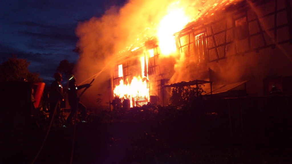 Dauer: 6,25 Std Einsatzdokumentation: Mittels Sirene und Funkmeldeempfänger wurde die FF Heiligenstadt zu einem Brand eines landwirtschaftlichen Anwesens im Ortsteil Oberleinleiter gerufen. Alarmspruch: "Alarm für die Feuerwehren Oberleinleiter, Heiligenstadt, Ebermannstadt und Umgebung...." Schon bei der Anfahrt war die Rauchsäule und der hell erleuchtete Himmel zu sehen. Beim Eintreffen befand sich eine Lagerhalle in Vollbrand - die Flammen schlugen meterhoch aus dem Gebäude. Der Dachstuhl und das obere Geschoss des direkt angebauten Stalles brannte bereits au - ebenso der Dachstuhl des anschließenden Wohnhauses. Die insgesamt 17 Feuerwehren konzentrierten sich zunächst auf die Rettung des Viehs und auf das Halten des Wohnhauses und der benachbarten Gebäude. Da die Leinleiter keine 100m vom Einsatzort entfernt fließt, gab es keine Probleme mit der Wasserversorgung. Gott sei Dank gab es keinen Personenschaden (2 Personen wurden vorsorglich ins Krankenhaus gebracht, waren jedoch am nächsten Morgen wieder zu Hause), lediglich 2 Rinder verendeten in den Flammen. Ein weiteres Rind musste am Folgetag geschlachtet werden. Laut Einsatzleiter, KBR B. Ziegmann, waren über 250 Einsatzkräfte vor Ort. Im einzelnen: 228 Feuerwehrkameradinnen und -kameraden (darunter KBI R. Schumm, KBI J. Farniol, KBI F. Riemer, KBM; S. Kormann, KBM B. Schlicht, KBM K. Schmaus und KBM J. Eberlein), 15 Mitglieder des Rettungsdienstes (Rotes Kreuz und Malteser) und 11 Personen der UG-ÖEL. Außerdem war die Polizei mit mehreren Beamten an der Einsatzstelle, ebenso wie die UF-ÖEL Bamberg-Land, das Atemschutzzentrum Strullendorf, Mitarbeiter des Landratamtes und 2 Tierärzte. Der Brandgeruch verteilte sich auf Grund der Wetterlage im ganzen Leinleitertal. Sogar im ca. 10 km entfernten Ebermannstadt riefen besorgte Bürger bei der Polizei an und meldeten Brandgeruch! Einige Feuerwehren übernahmen die Brandwache. Am Folgetag gegen 07.00 Uhr wurden sie abgelöst. (siehe "Der Tag danach")