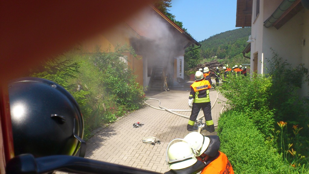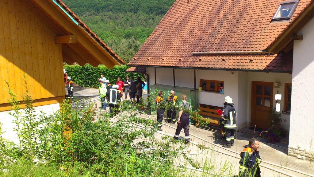 aus dem auf dem Grundstück liegenden Swimming Pools. Aus Ebermannstadt kam die Drehleiter und ein TLF. Das Feuer konnte