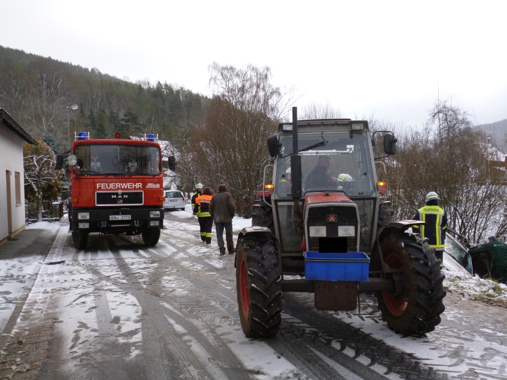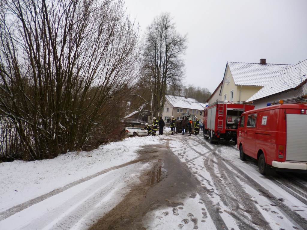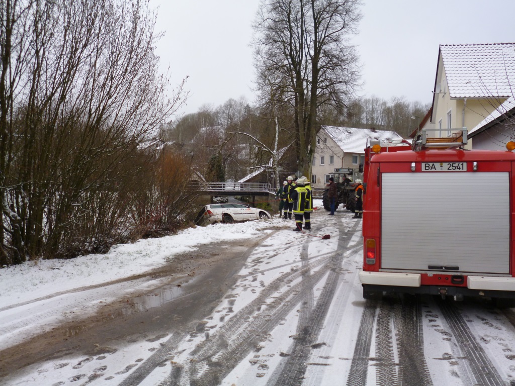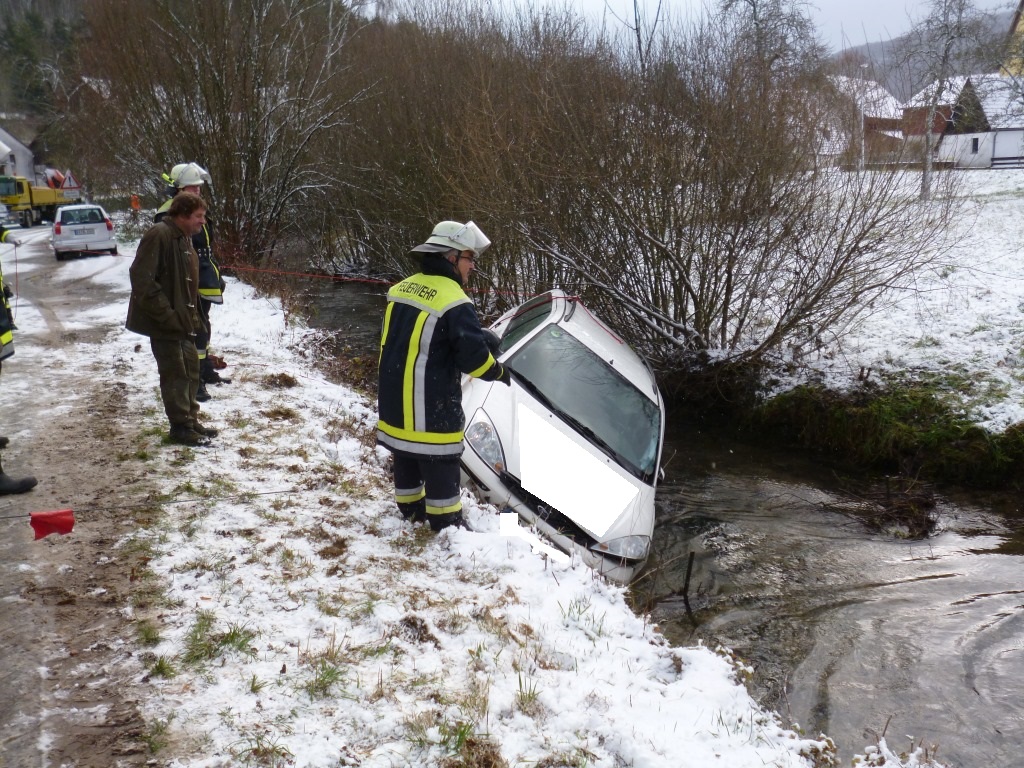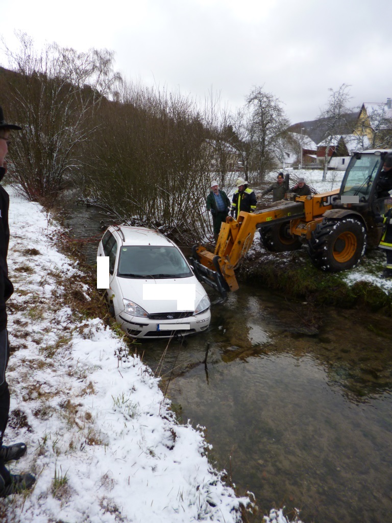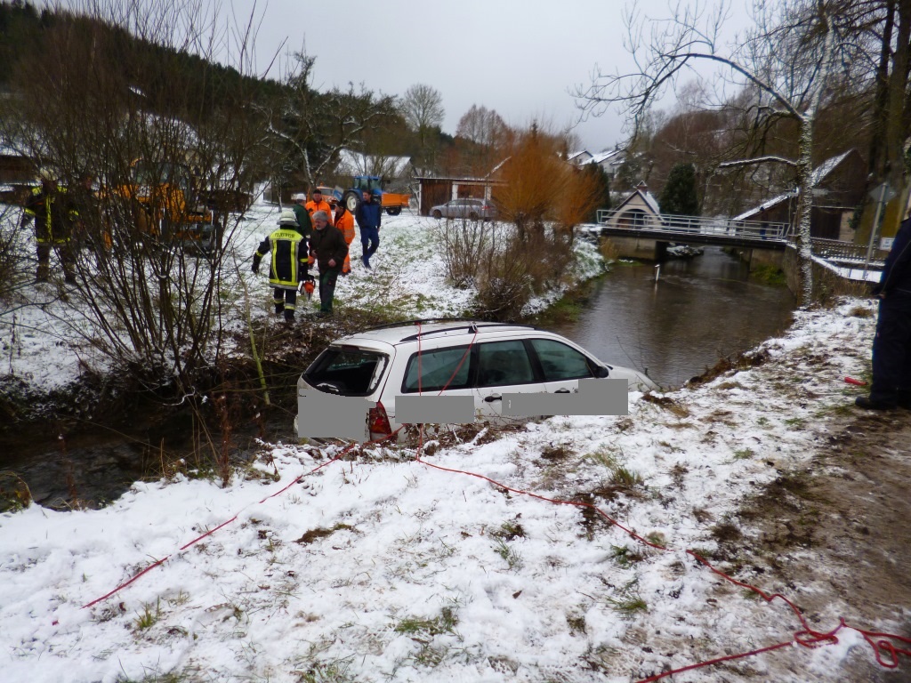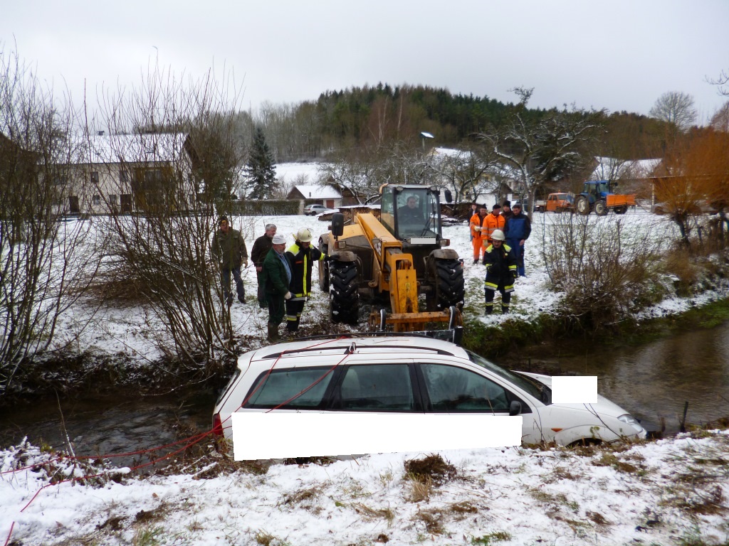 Dauer: 1 Std Einsatzdokumentation: Die FF Heiligenstadt wurde zusammen mit den Wehren aus Oberleinleiter und Zeegendorf alarmiert. In Oberleinleiter rutschte ein PKW witterungsbedingt in die neben der Staatsstrasse fließende Leinleiter. Laut Alarmspruch sei eine Person eingeklemmt. Beim Eintreffen der FF Heiligenstadt hatte die Person das Fahrzeug bereits verlassen. Vorsorglich wurde sie dem Rettungsdienst übergeben, der sie in ein Krankenhaus brachte. Das Fahrzeug wurde aus der Leinleiter geborgen. Neben den Feuerwehren waren das BRK mit einem NAW und einem RTW vor Ort, sowie die Polizei.
