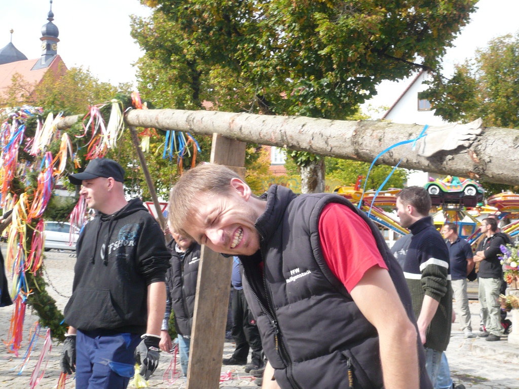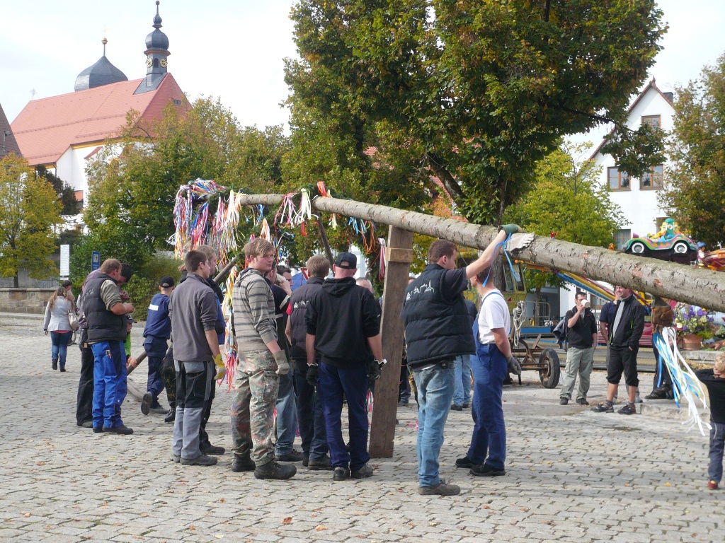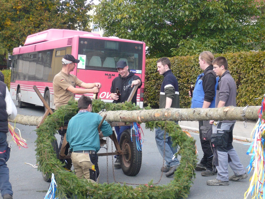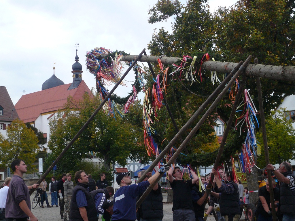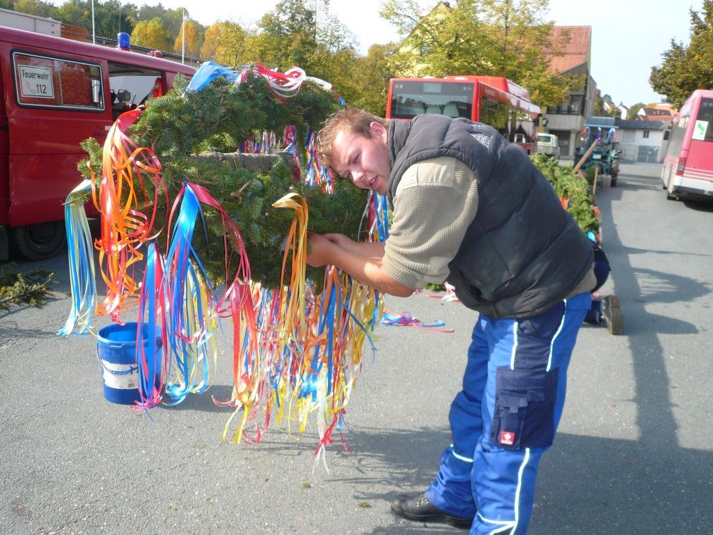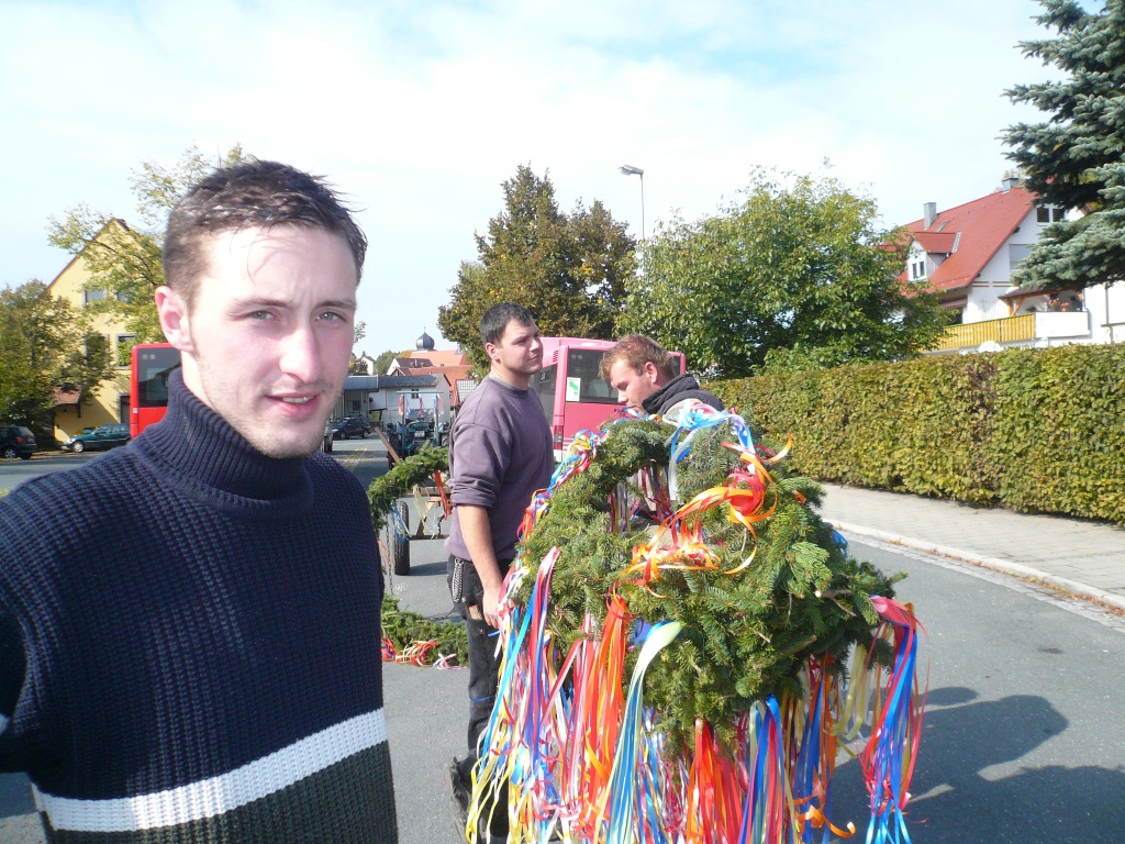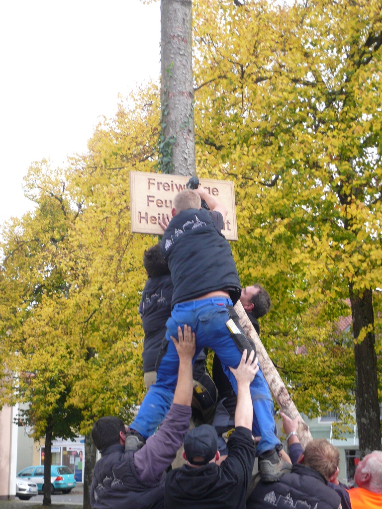 Traditionsgemäß stellte die FF Heiligenstadt auch in diesem Jahr wieder den Kerwa-Baum auf. Während "die Männer" den Baum holten, banden "die Frauen" den Kranz. Der Kranz wird "angepasst". Die Schleifen müssen auch vorbereitet werden. Wenigstens kann man sich dazu setzen :-) Sieht schon recht gut aus. Die Spitze wird auch schon.... Gleich geht's los - und die Jüngsten dürfen mit dabei sein (Nachwuchsgewinnung und -förderung :-) ) Helmut, wenn Du Deine Hände suchst,.... Und jetzt setzt sich der Zug in Bewegung - für die lange Marschstrecke und den beschwerlichen Weg sowie für die kräftezehrende Arbeit wurde extra ein Verpflegungsgefährt beschafft! Mit Musik geht es besser! Die Hauptstrasse ist erreicht. Und nun der Schwenk zum Marktplatz Der Marktplatz ist erreicht - und der Fahrer muss sich nun voll konzentrieren, damit er sein Gefährt an die richtige Stelle bringt. Eine letzte Stärkung, bevor das Aufstellen beginnt ... und die Musik spielt dazu Bewundernde Blicke für die Kameraden, die den Baum aufstellen ;-) Eine wichtige Aufgabe: den Baum genau in das "Loch" zu postieren - unser Bürgermeister höchstpersönlich überwcht dies. Was will uns dieser Gesichtsausdruck sagen? So langsam geht's aufwärts. Rainer hat das Kommando Mach mal ein schönes Gesicht Geht doch Auch das Zuschauen macht hungrig Passt's vorne? Ja! Arbeitsteilung: zwei schauen nach oben, zwei nach unten Bald ist es soweit Sieht schon fast gut aus! Und jetzt die Akrobatennummer (Gerüchten zu Folge soll diese akrobatische Leistung ins Sommerprogramm des Zirkus Krone aufgenommen werden - die menschliche Pyramide) Noch ist es kostenlos - im Sommer dann wird EIntritt verlangt! Und dann wurde Kerwa gefeiert - gleich beim Aichinger am Marktplatz Maddin mit seiner Quetsche spielte wieder auf und brachte eine Bombenstimmung in die Gaststube