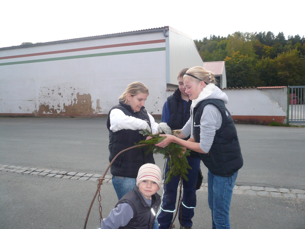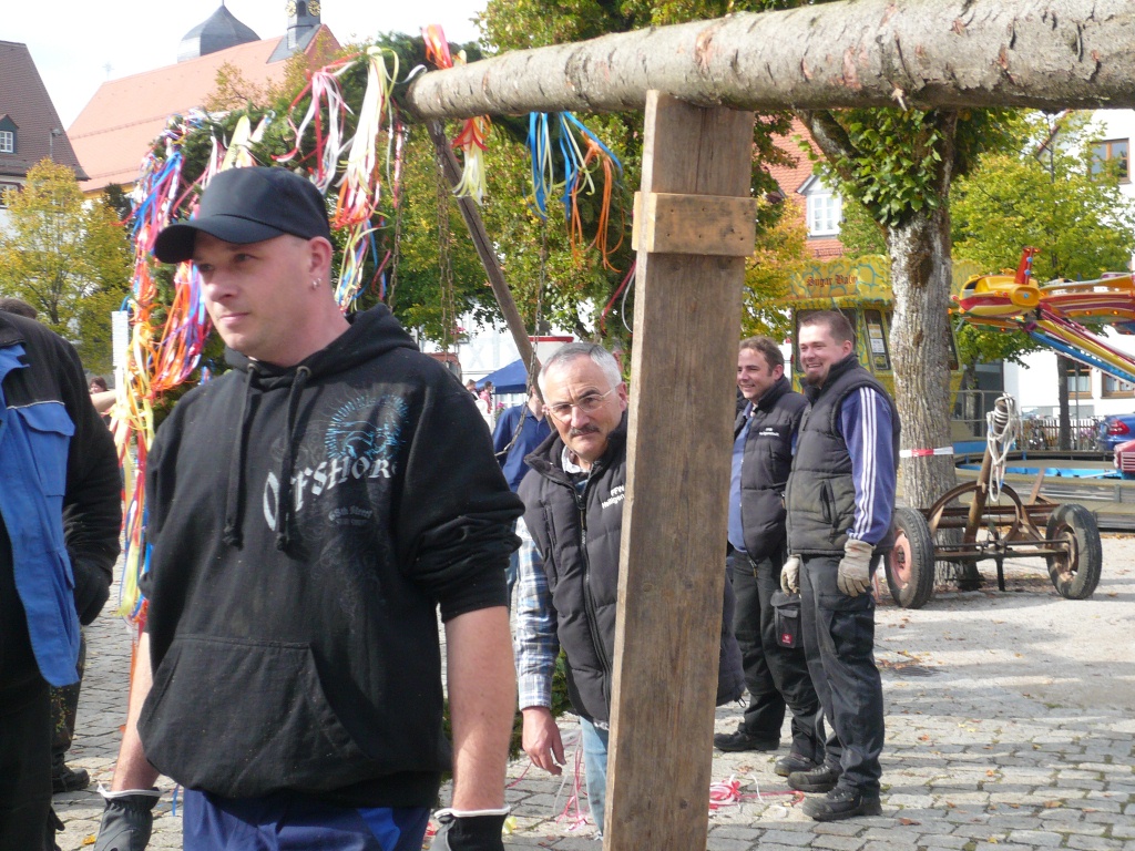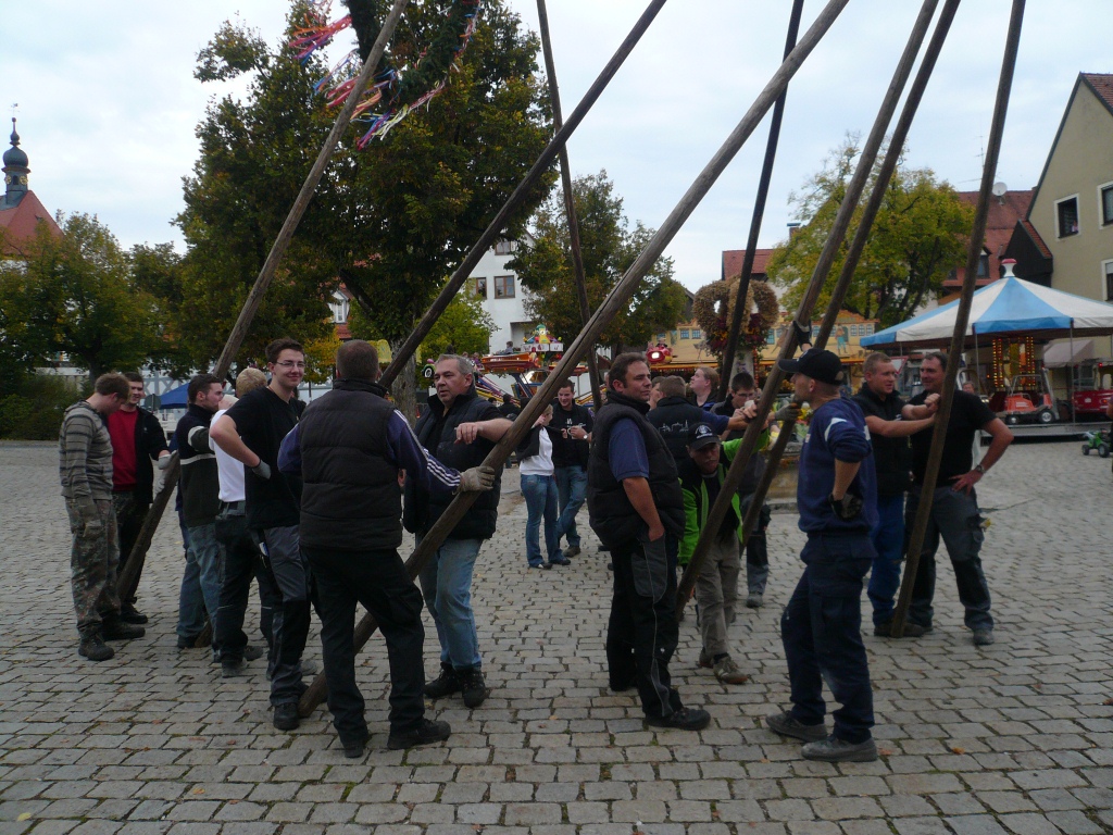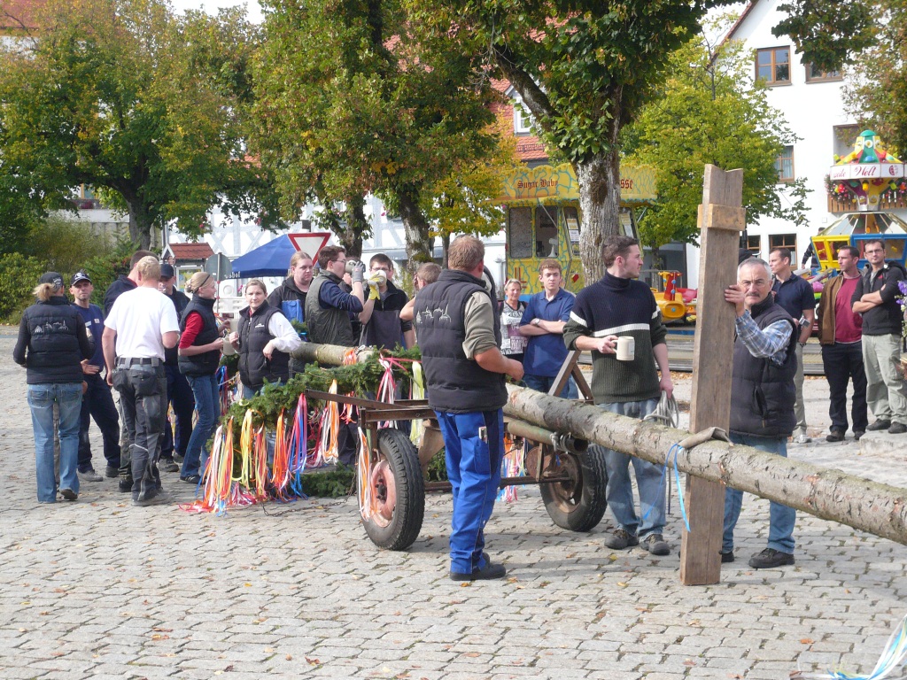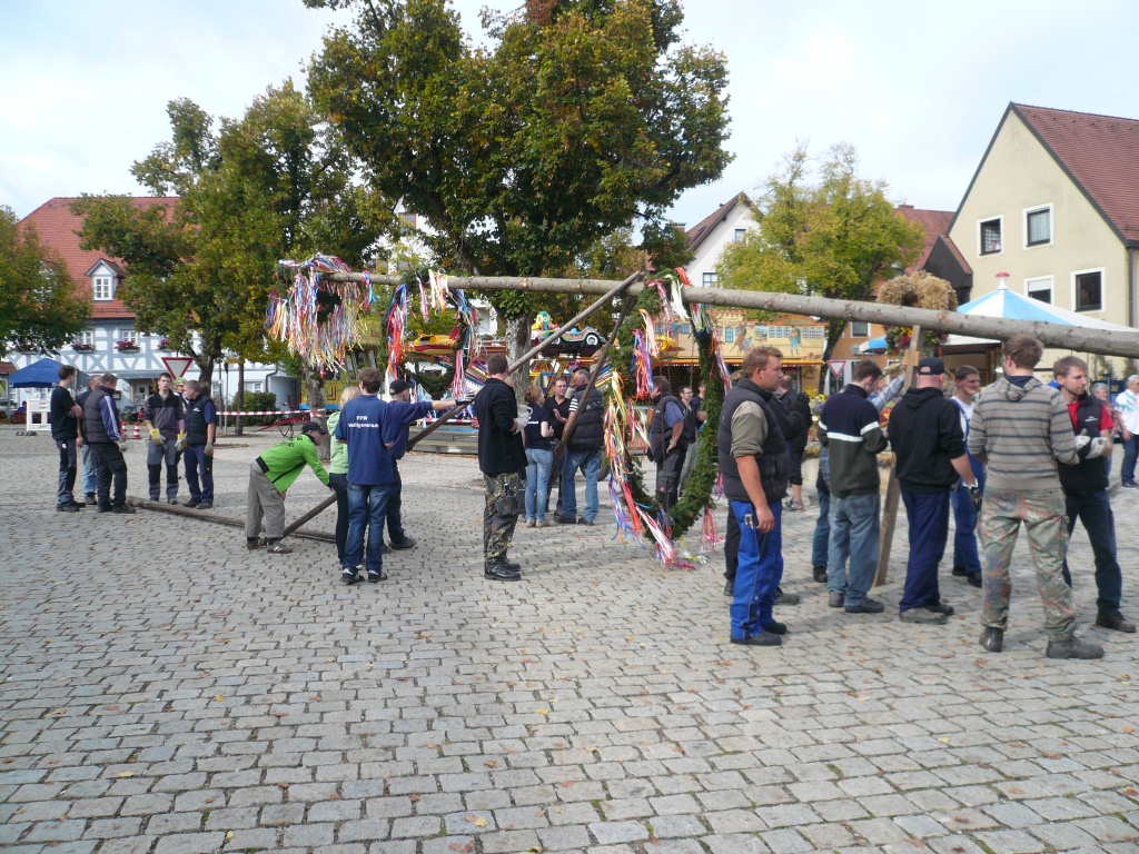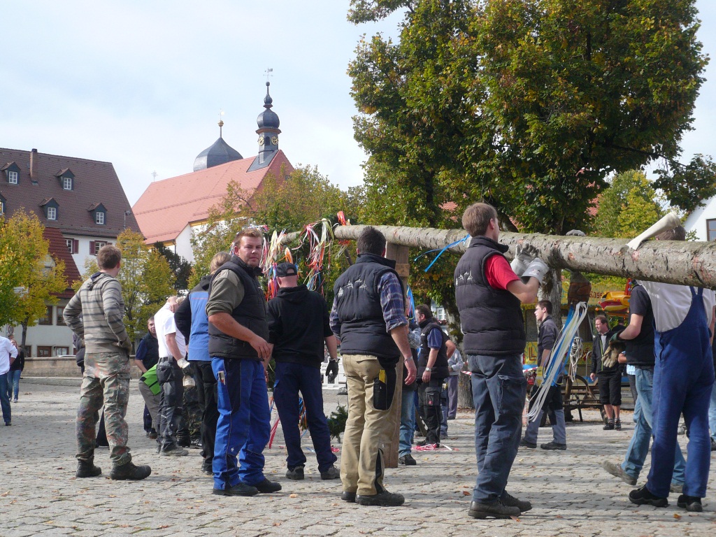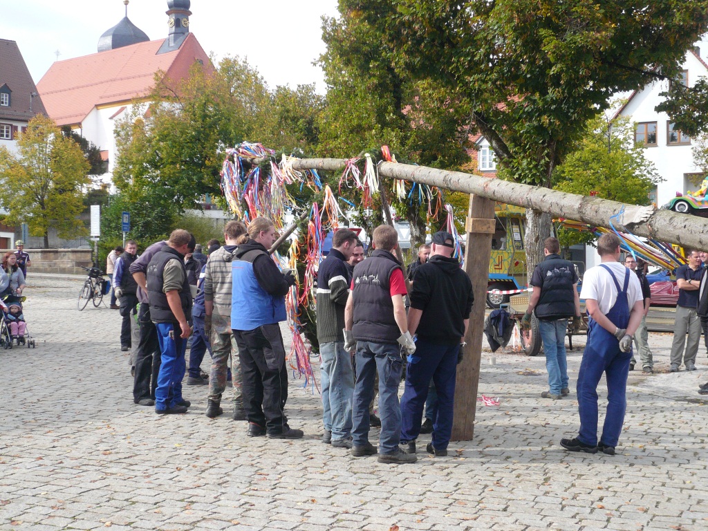 Traditionsgemäß stellte die FF Heiligenstadt auch in diesem Jahr wieder den Kerwa-Baum auf. Während "die Männer" den Baum holten, banden "die Frauen" den Kranz. Der Kranz wird "angepasst". Die Schleifen müssen auch vorbereitet werden. Wenigstens kann man sich dazu setzen :-) Sieht schon recht gut aus. Die Spitze wird auch schon.... Gleich geht's los - und die Jüngsten dürfen mit dabei sein (Nachwuchsgewinnung und -förderung :-) ) Helmut, wenn Du Deine Hände suchst,.... Und jetzt setzt sich der Zug in Bewegung - für die lange Marschstrecke und den beschwerlichen Weg sowie für die kräftezehrende Arbeit wurde extra ein Verpflegungsgefährt beschafft! Mit Musik geht es besser! Die Hauptstrasse ist erreicht. Und nun der Schwenk zum Marktplatz Der Marktplatz ist erreicht - und der Fahrer muss sich nun voll konzentrieren, damit er sein Gefährt an die richtige Stelle bringt. Eine letzte Stärkung, bevor das Aufstellen beginnt ... und die Musik spielt dazu Bewundernde Blicke für die Kameraden, die den Baum aufstellen ;-) Eine wichtige Aufgabe: den Baum genau in das "Loch" zu postieren - unser Bürgermeister höchstpersönlich überwcht dies. Was will uns dieser Gesichtsausdruck sagen? So langsam geht's aufwärts. Rainer hat das Kommando Mach mal ein schönes Gesicht Geht doch Auch das Zuschauen macht hungrig Passt's vorne? Ja! Arbeitsteilung: zwei schauen nach oben, zwei nach unten Bald ist es soweit Sieht schon fast gut aus! Und jetzt die Akrobatennummer (Gerüchten zu Folge soll diese akrobatische Leistung ins Sommerprogramm des Zirkus Krone aufgenommen werden - die menschliche Pyramide) Noch ist es kostenlos - im Sommer dann wird EIntritt verlangt! Und dann wurde Kerwa gefeiert - gleich beim Aichinger am Marktplatz Maddin mit seiner Quetsche spielte wieder auf und brachte eine Bombenstimmung in die Gaststube