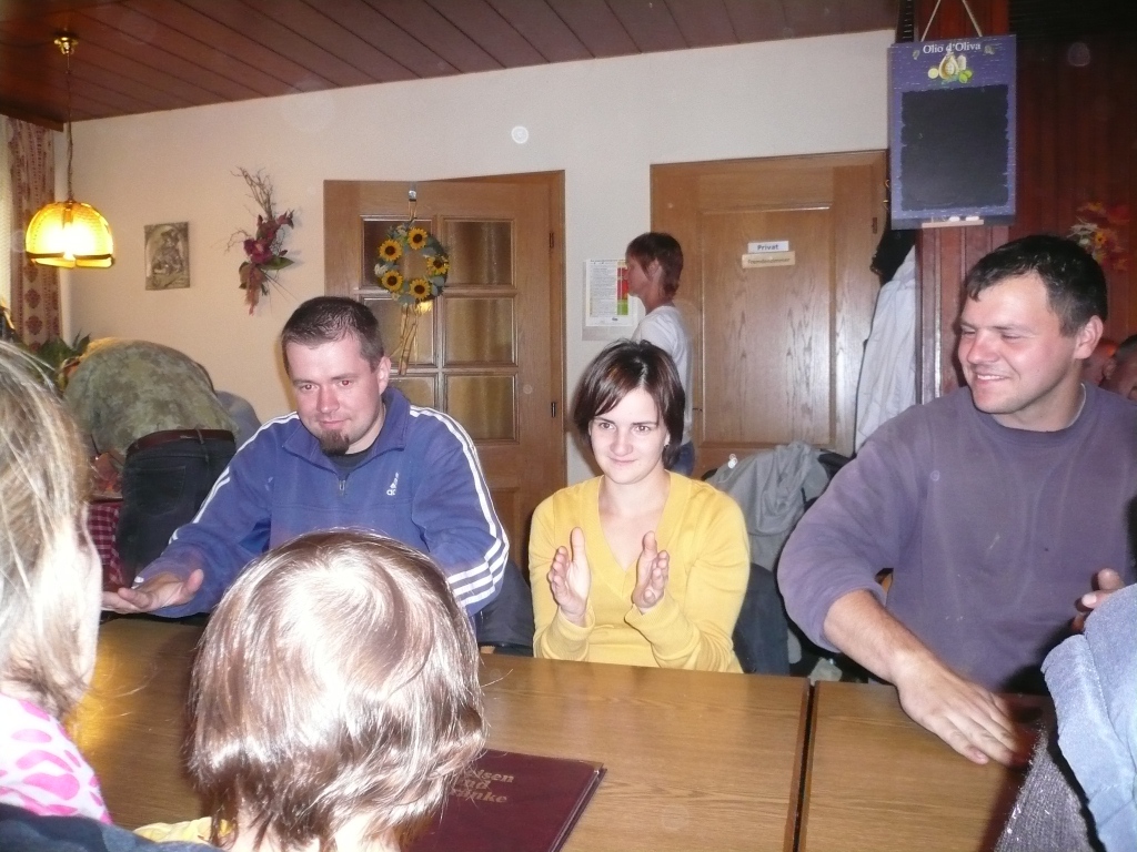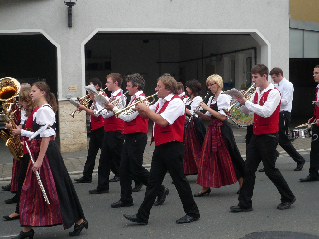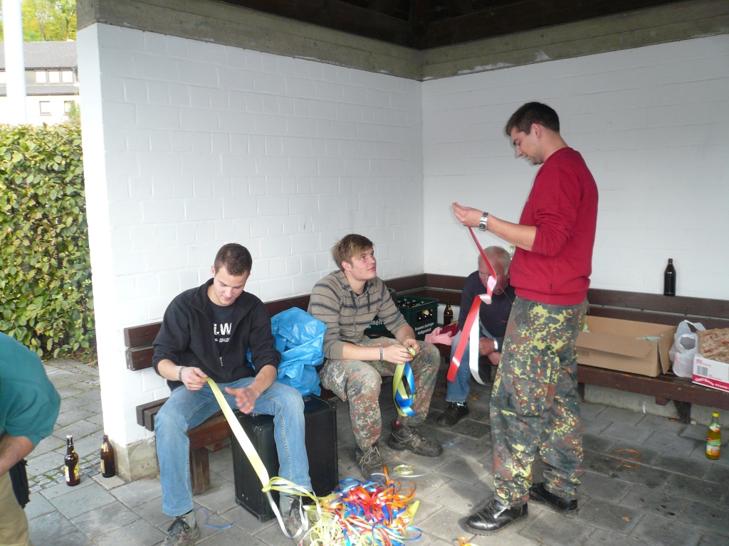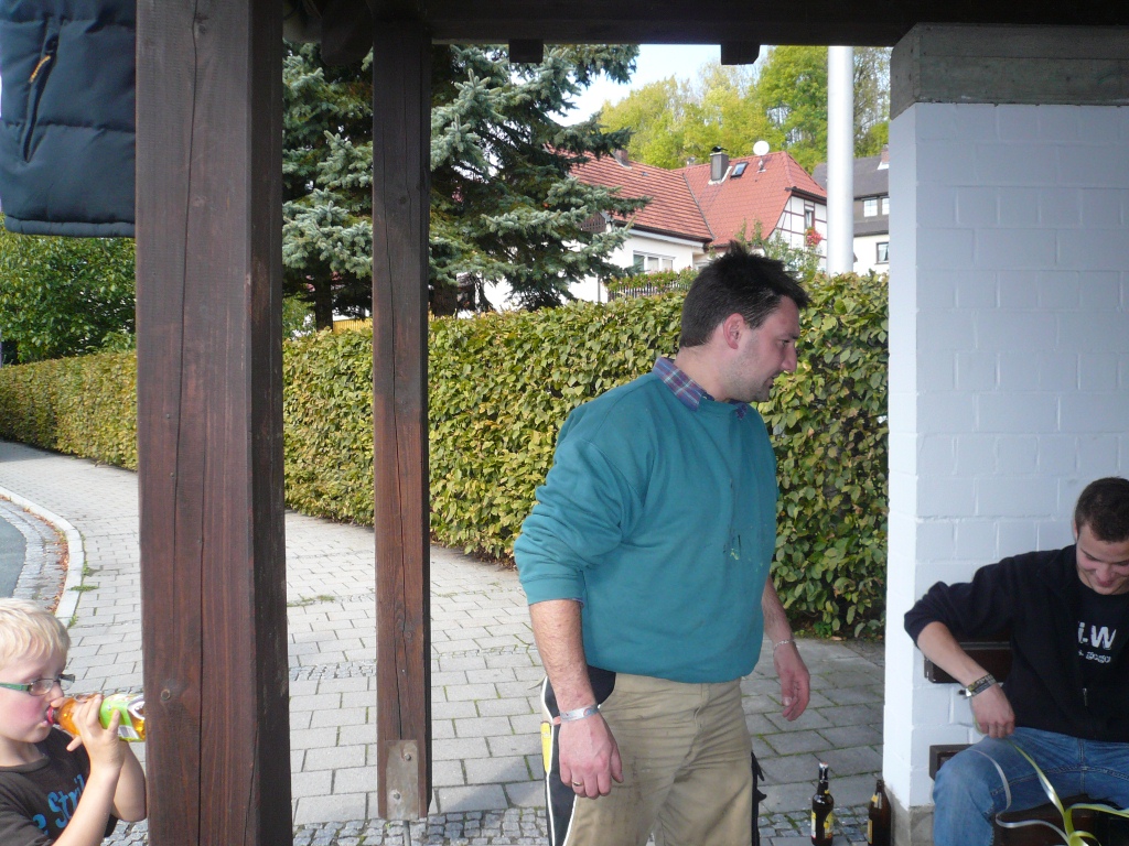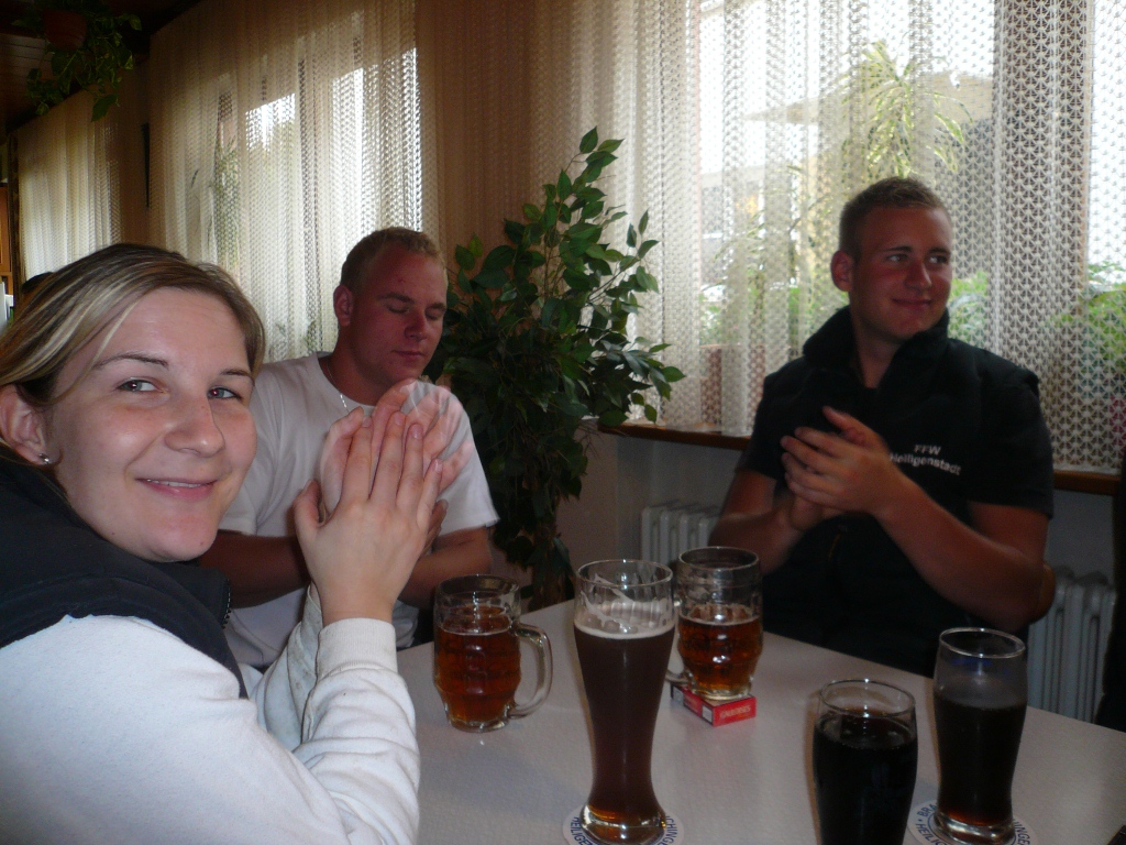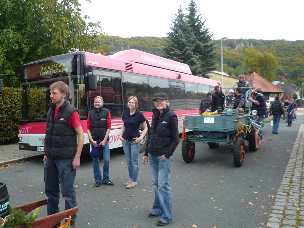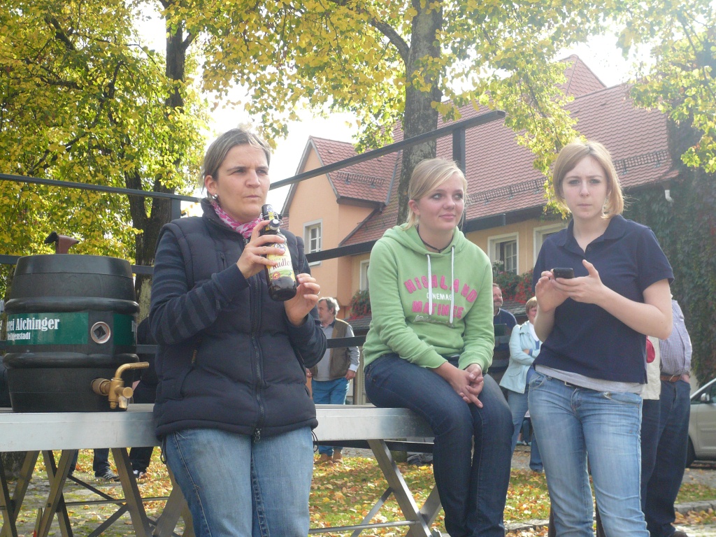Traditionsgemäß stellte die FF Heiligenstadt auch in diesem Jahr wieder den Kerwa-Baum auf. Während "die Männer" den Baum holten, banden "die Frauen" den Kranz. Der Kranz wird "angepasst". Die Schleifen müssen auch vorbereitet werden. Wenigstens kann man sich dazu setzen :-) Sieht schon recht gut aus. Die Spitze wird auch schon.... Gleich geht's los - und die Jüngsten dürfen mit dabei sein (Nachwuchsgewinnung und -förderung :-) ) Helmut, wenn Du Deine Hände suchst,.... Und jetzt setzt sich der Zug in Bewegung - für die lange Marschstrecke und den beschwerlichen Weg sowie für die kräftezehrende Arbeit wurde extra ein Verpflegungsgefährt beschafft! Mit Musik geht es besser! Die Hauptstrasse ist erreicht. Und nun der Schwenk zum Marktplatz Der Marktplatz ist erreicht - und der Fahrer muss sich nun voll konzentrieren, damit er sein Gefährt an die richtige Stelle bringt. Eine letzte Stärkung, bevor das Aufstellen beginnt ... und die Musik spielt dazu Bewundernde Blicke für die Kameraden, die den Baum aufstellen ;-) Eine wichtige Aufgabe: den Baum genau in das "Loch" zu postieren - unser Bürgermeister höchstpersönlich überwcht dies. Was will uns dieser Gesichtsausdruck sagen? So langsam geht's aufwärts. Rainer hat das Kommando Mach mal ein schönes Gesicht Geht doch Auch das Zuschauen macht hungrig Passt's vorne? Ja! Arbeitsteilung: zwei schauen nach oben, zwei nach unten Bald ist es soweit Sieht schon fast gut aus! Und jetzt die Akrobatennummer (Gerüchten zu Folge soll diese akrobatische Leistung ins Sommerprogramm des Zirkus Krone aufgenommen werden - die menschliche Pyramide) Noch ist es kostenlos - im Sommer dann wird EIntritt verlangt! Und dann wurde Kerwa gefeiert - gleich beim Aichinger am Marktplatz Maddin mit seiner Quetsche spielte wieder auf und brachte eine Bombenstimmung in die Gaststube