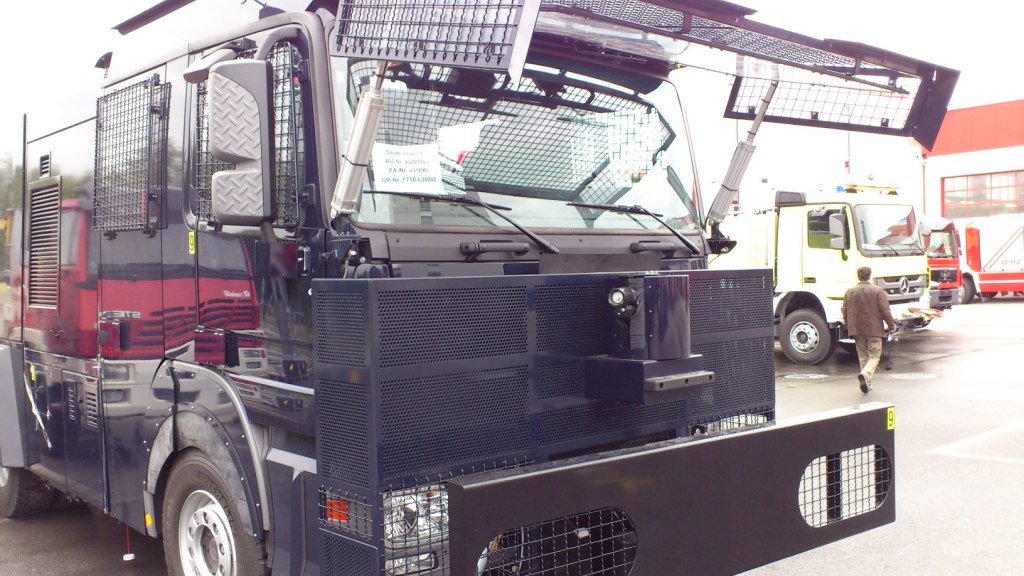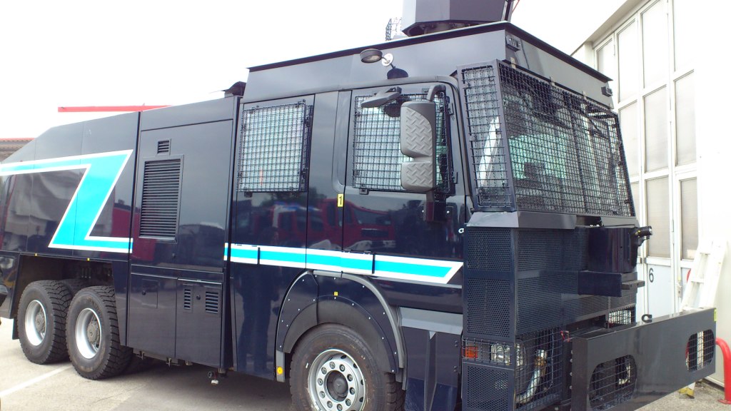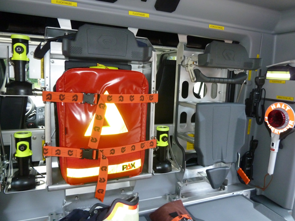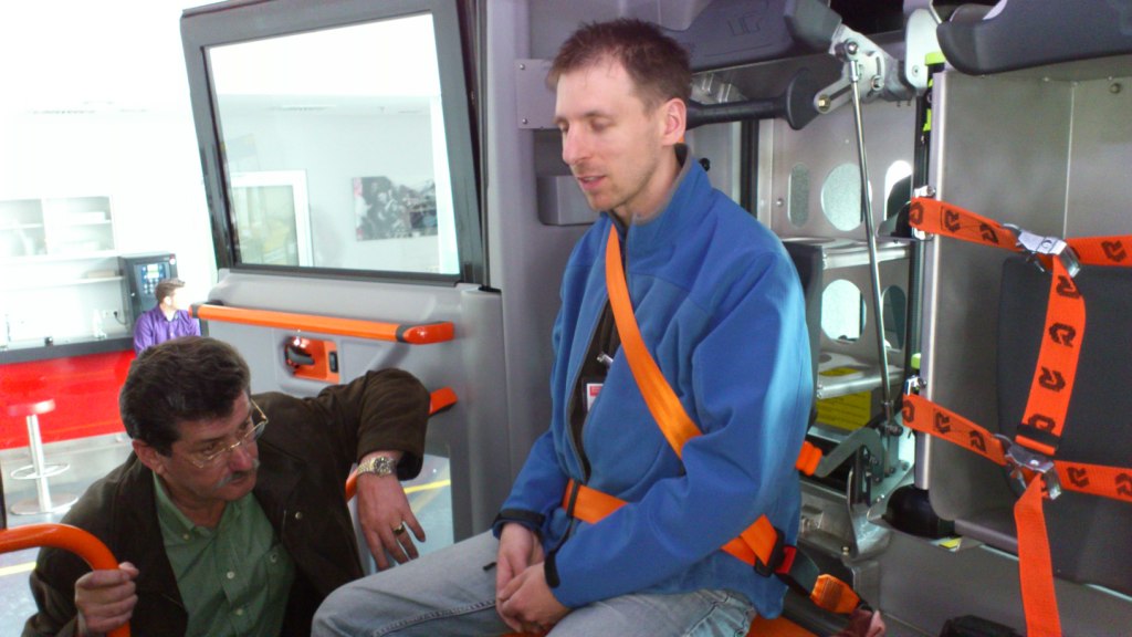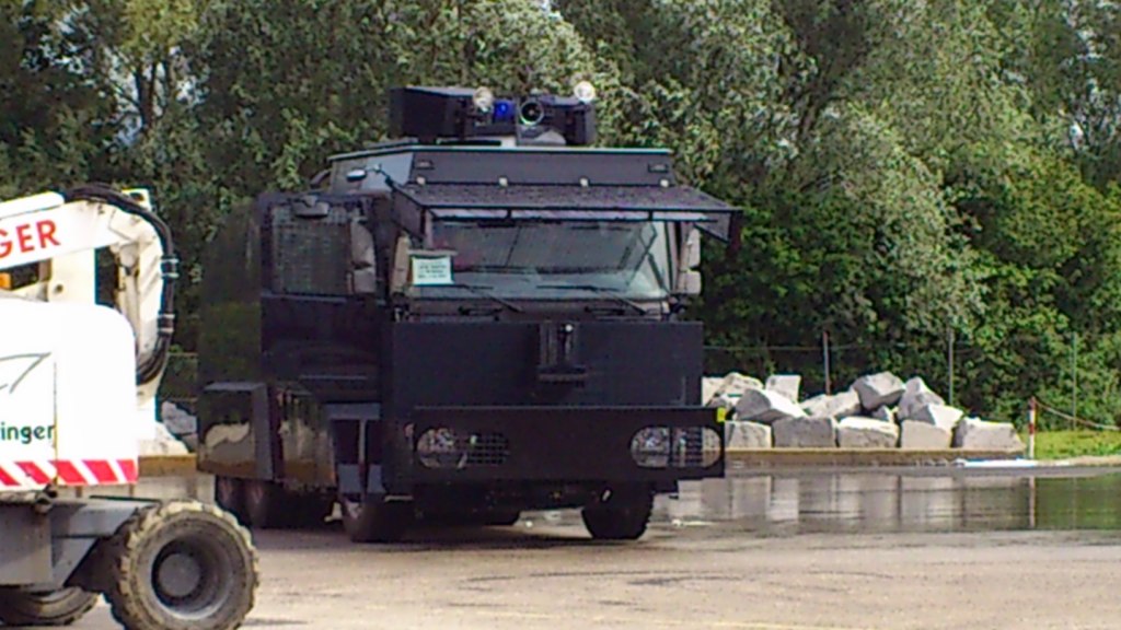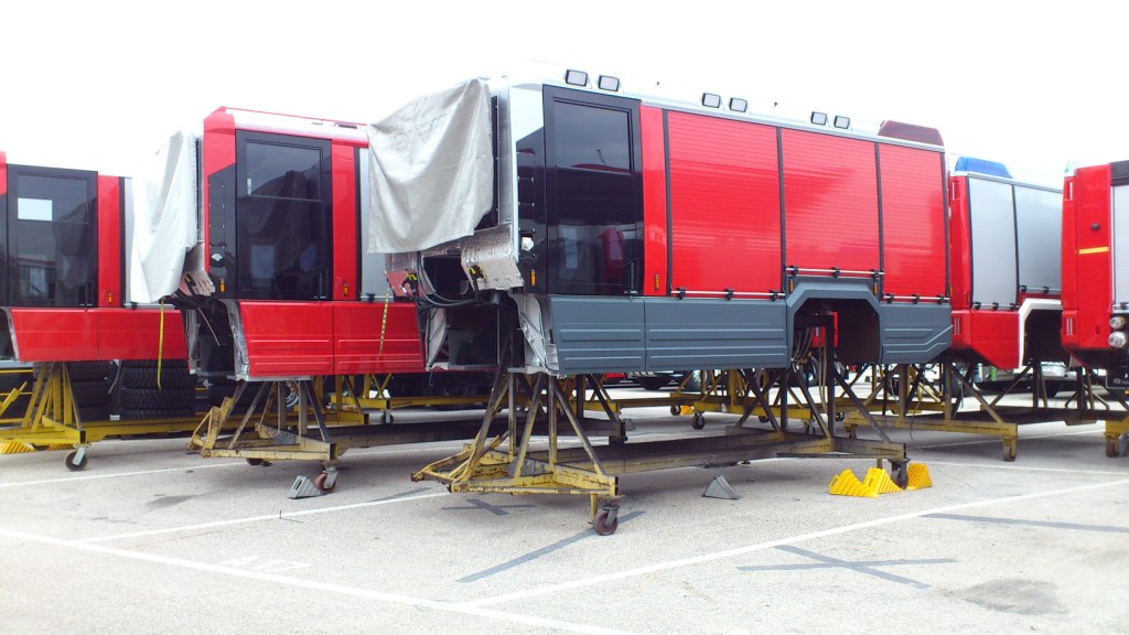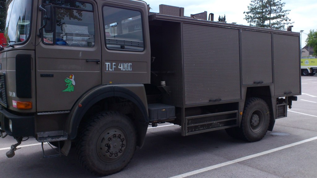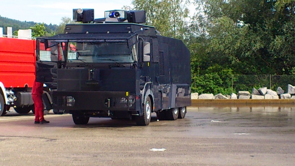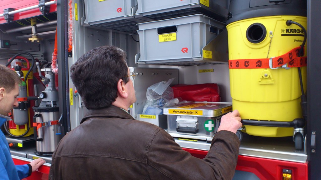 Nun sind wir in der Abholhalle: Christof mit seinem Werkzeug, dem... Der Kommandant angeschnallt im Mannschaftsraum. Beim Mittagessen Und wieder im Freigelände: ein Wasserwerfer der Polizei. Aufbauten, die auf Fahrgestelle warten, ... ... und Fahrgestelle, deren Aufbau noch nicht fertig ist. Unter den weißen Planen befinden sich Fahrgestelle des Panthers. Das heißt Rosenbauer! Der "große" Panther (8x8)