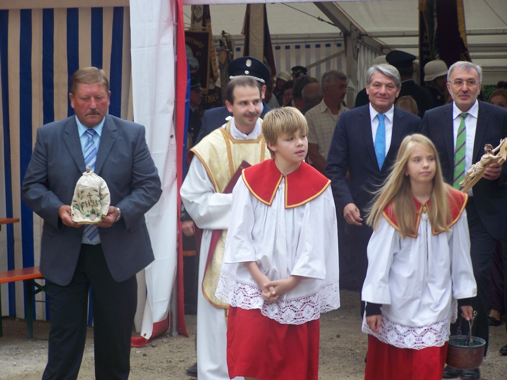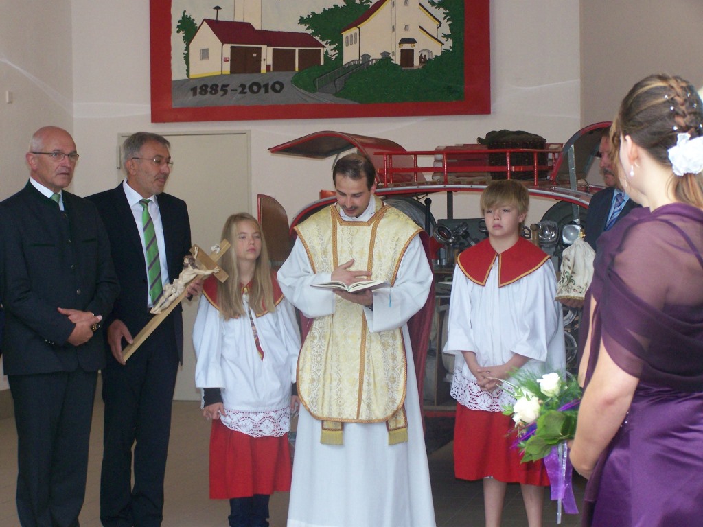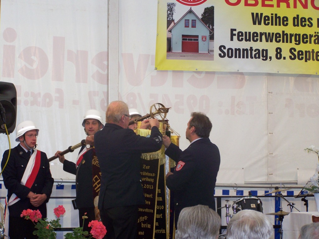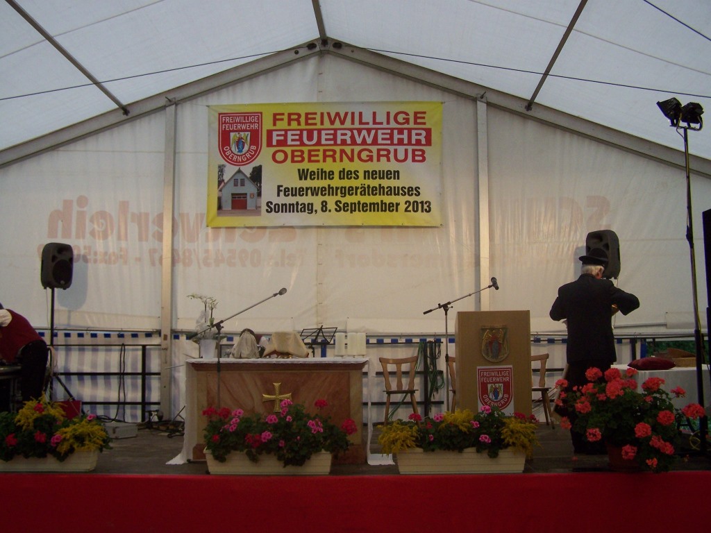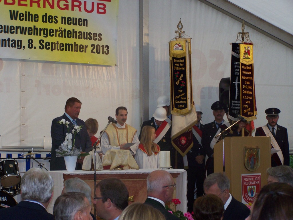 Gerätehausweihe der FF Oberngrub Am 8. September 2013 fand nach einem Festgottesdienst die feierliche Weihe des neuen Gerätehauses in Oberngrub statt. In seiner Predigt würdigte H.H. Pfarrer Kaiser die Gemeinschaftsarbeit der Kameradinnen und Kameraden, die in den letzten 4 Jahren mehr als 4000 Stunden für ihr Gerätehaus investiert hatten. Er wies darauf hin, dass nicht jeder Bau unter so einem guten Stern (siehe Flughafen Berlin-Brandenburg) stehe wie die Errichtung des inzwischen dritten Gerätehauses der FF Oberngrub. Die Zahl "3" hat ja in christlichen Glauben eine besondere Stellung - wir haben einen dreieinen Gott. Auch gibt es ja des Sprichwort: "Aller guten Dinge sind drei". Im übrigen ist ´der hohe Dom zu Bamberg ebenfalls der dritte Dom, der in Bamberg gebaut wurde - und dieser steht schon über 1000 Jahre! Bürgermeister Krämer stiftete für das Gerätehaus ein Kruzifix, das ebenfalls gesegnet und dann von ihm persönlich an seinem Platz angebracht wurde.