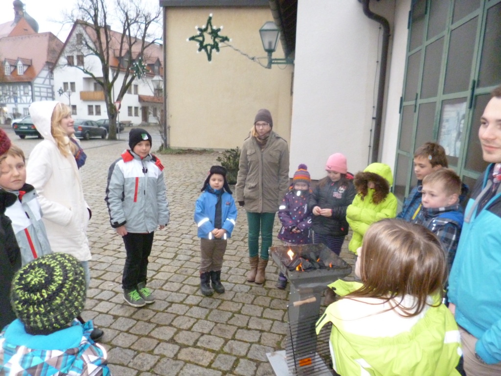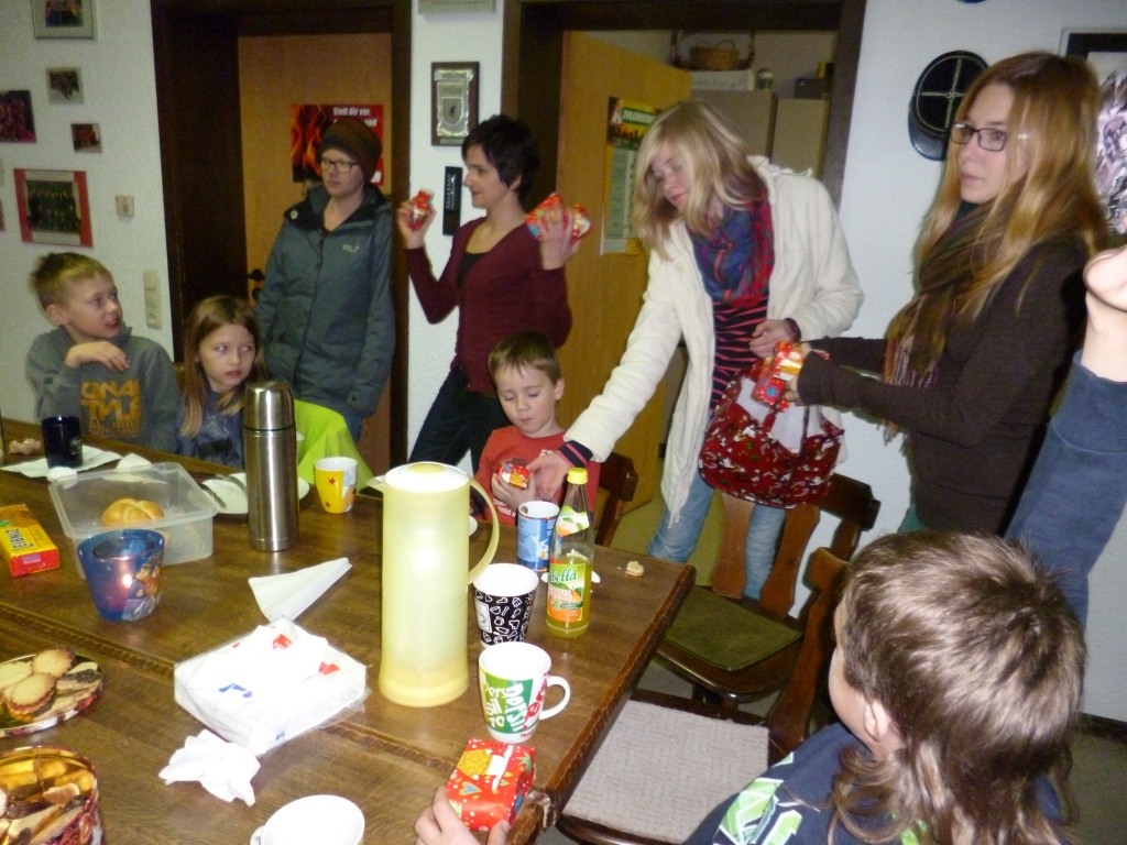 Der Grill ist schon angeschürt, damit man sich nach dem Krippenweg stärken kann. Die Lösch-Schnecken erzählten die Weihnachtsgeschichte, natürlich auch den Weg nach Bethlehem. Kinderpunsch und Plätzchen durften natürlich nicht fehlen, ... ... ebenso wenig ein kleines Geschenk. |
