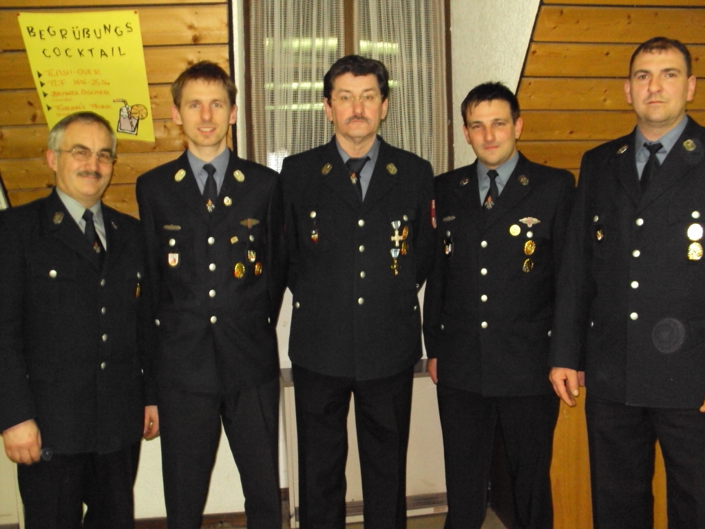 Das obligatorische Gruppenbild: die Geehrten mit der Feuerwehrführung: v.l.n.r: 2. Kdt B. Bächmann, 1. Kdt Ch. Ott (in Doppelfunktion: auch als Geehrter :-) ), Siegmund Göller, 1. Vorstand P. Bächmann, 2. Vorstand M. Baier