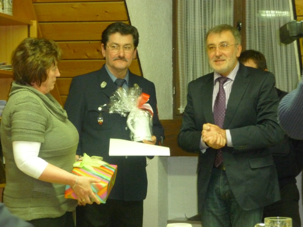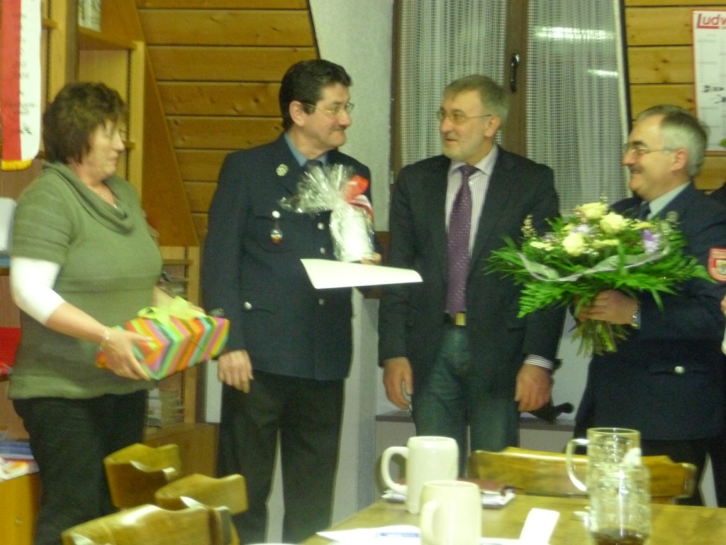 An der diesjährigen JHV der FF Heiligenstadt wurden zwei verdiente Mitglieder geehrt: Siegmund Göller erhielt für seine 40jährige aktive Mitgliedschaft in der FF Heiligenstadt das goldene Ehrenkreuz. Bürgermeister Krämer ging in seiner Laudation kurz auf die Dienstzeit des Geehrten ein: Mehr als die Hälfte dieser 40 Jahre übt Siegmund Göller das Amt des Zeugwartes aus. Fahrzeuge und Gerätschaften sind immer Top in Schuss - auch für die anderen Wehren der Marktgemeinde ist er Ansprechpartner im Bereich Fahrzeug/Gerät. Als Anerkennung erhielt Siegmund aus der Hand des Bürgermeisters einen Bierkrug. Auch seine Frau Hildegard bekam ein Präsent vom Bürgermeister. Auch Kommandant Christian Ott gratulierte dem Jubilar und bedankte sich ebenfalls mit einem Bierkrug. Aus der Hand des 2. Kommandanten Berthold Bächmann erhielt Hildegard Göller einen Blumenstrauß.