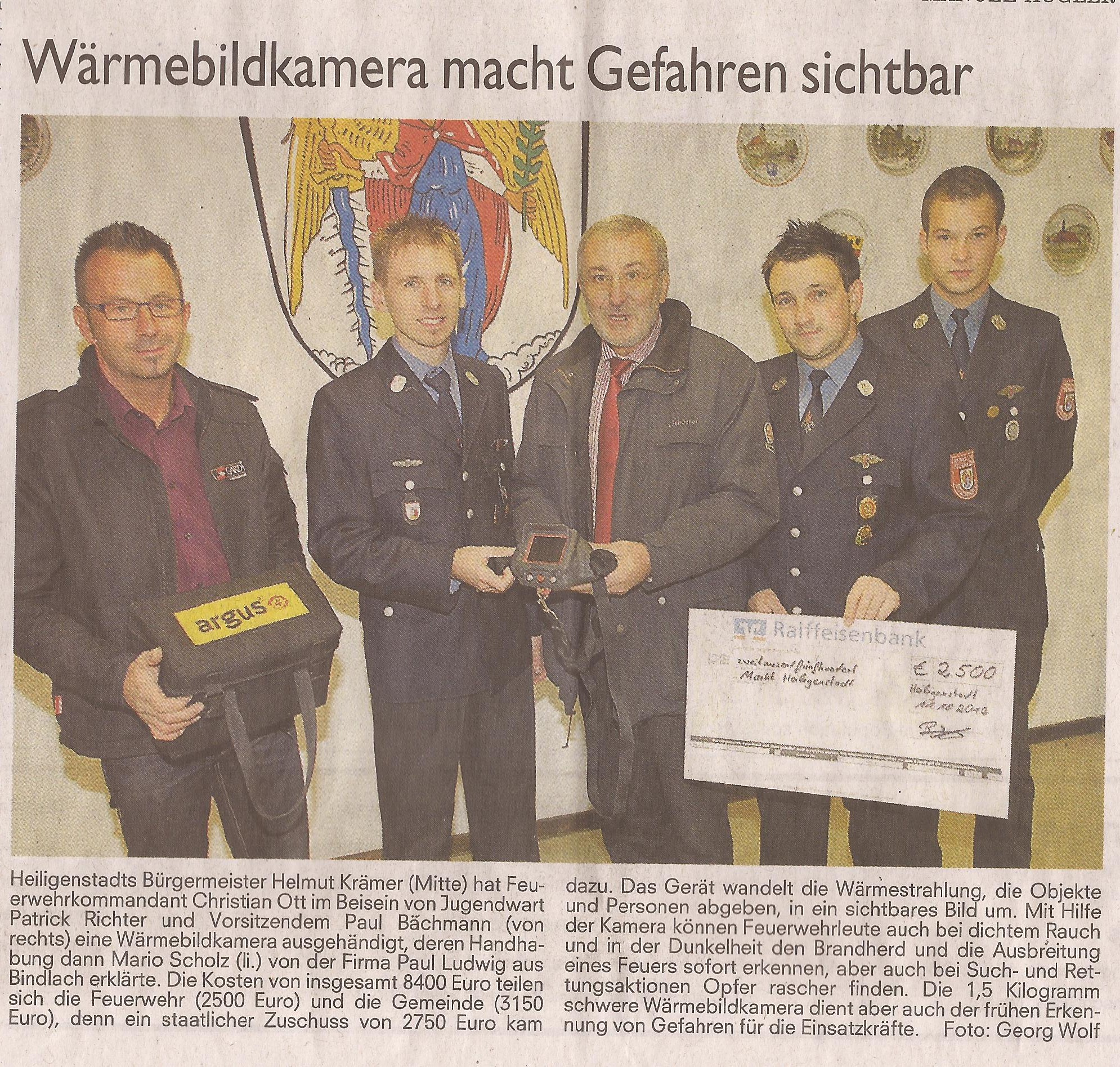 Die FF Heiligenstadt hat nun eine Wärmebildkamera in ihrem Bestand. Sie wurde von Bgm. Krämer übergeben. Hier der Zeitungsbericht aus den "Nürnberger Nachrichten" vom 13. Oktober 2012: